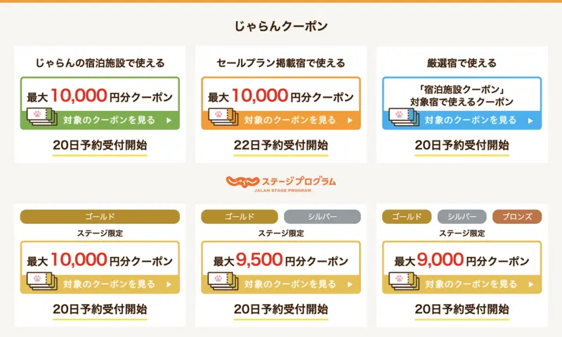 通常の宿泊予約に使える最大10,000円分クーポンに加え、セールプラン掲載宿専用(22日予約開始)や、厳選宿向けの「宿泊施設クーポン」も用意。さらに、ゴールド・シルバー・ブロンズなどステージ別に最大10,000円分のステージ限定クーポンも登場しています。これらのクーポンは併用可能で、最大20%お得になります!