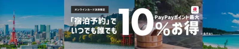 | 割引内容・特典 | 対象のホテル・旅館が特別割引&PayPayポイント還元 (ポイントの「いまスグ利用」で最大40%以上お得になるプランあり) |