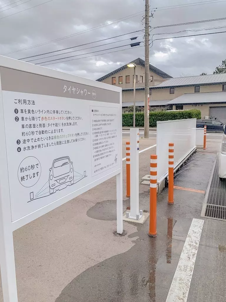 車の下部を洗い流してくれるタイヤシャワーが!約1分間水が出て、砂を洗い流してくれます(無料)。