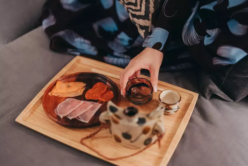 お酒のあてとなるおつまみを選んだら、部屋でしっぽりと晩酌をスタート。好きな音楽をかけたり、会話を楽しんだり、自分ならではの自由な時間を最後まで過ごすことができる。全てのラウンジは24時間、オールタイムで開いているため、お酒がなくなったら何度でも調達に。