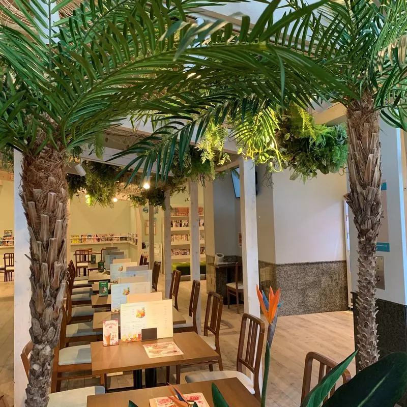 飲食持ち込み禁止ですが、南国っぽいお洒落な「Cafe」が1階にあります◎