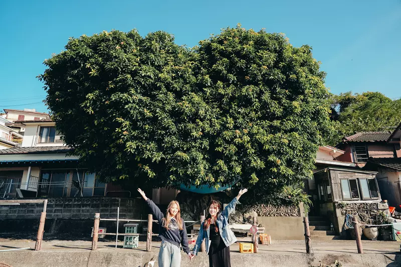 猫からの歓迎を一通り受けたら、島内の探索に出かけましょう!最初にやってきたのは、湯島港から徒歩2分ほどの場所にある「ハートの樹」。
