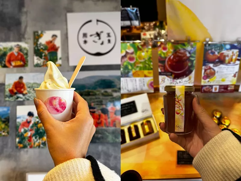 お昼休憩は「ぷらっとぎょくとう」でひと休み。『玉東町(ぎょくとうまち)』は「ハニーローザ」といわれるスモモの1種が有名な地域(※)です。