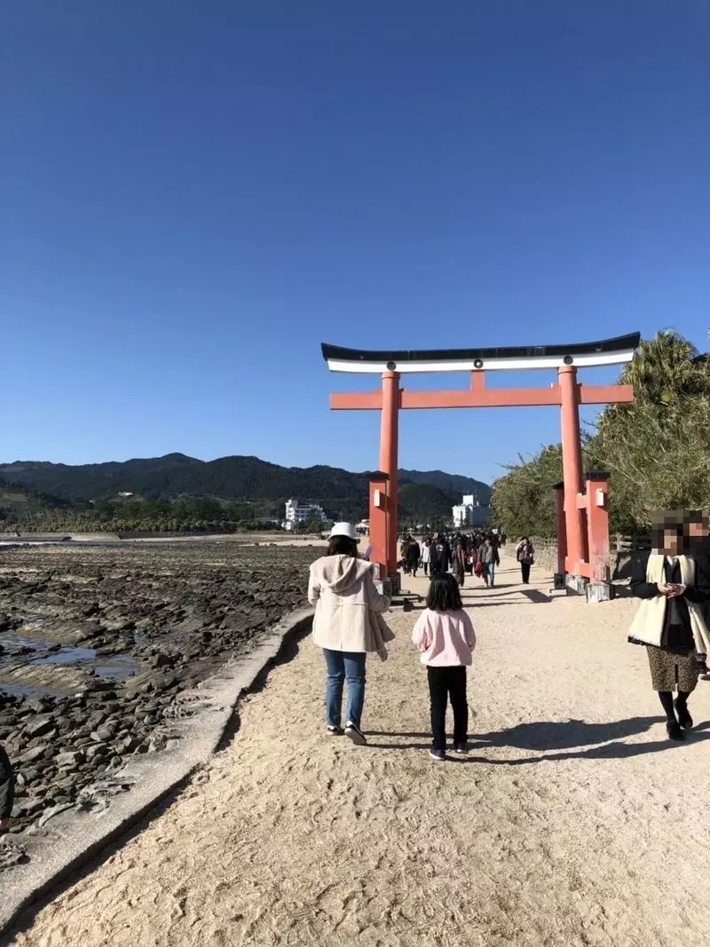神社の入り口と参道は…なんと砂地。海に浮かぶ神社ならではの光景です。砂と鳥居の組み合わせが絶妙にマッチしています。