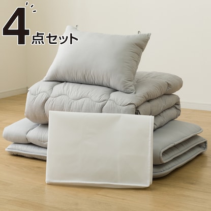 『アイリスオーヤマ』の「布団4点セット」は、収納ケースが付いた、新生活のスタートにもぴったりな布団セット。掛け布団、敷き布団、枕にピーチスキン加工(※)を施し、なめらかなで柔らかい風合いが特徴です。