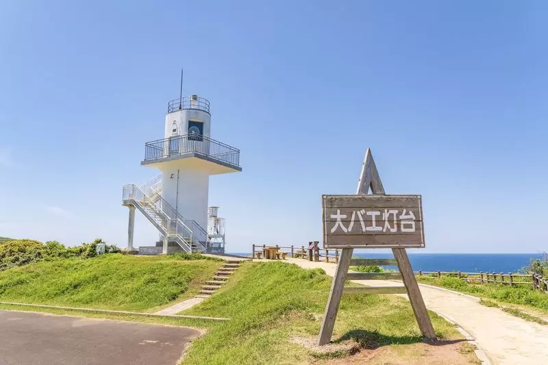 「大バエ灯台」は、切り立つ大バエ断崖の上にたつ白亜の無人灯台です。全国でも珍しい展望所が設置されており、雄大な景色を楽しむことができるんです!