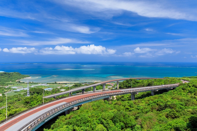 『ニライカナイ橋』は沖縄本島南部の南城市にある橋で、絶景が楽しめるドライブコースとして人気です。二本の橋がS字状に連なり、緩やかな勾配を描いて海岸沿いの高台へと続きます。