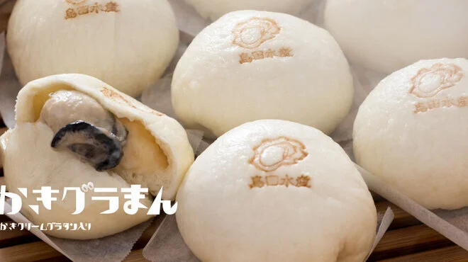 島田水産では食べ歩きできるテイクアウトのメニューも用意されており、なかでもおすすめなのがかきを一粒丸ごと包んだ「かきグラまん」450円(税込)。