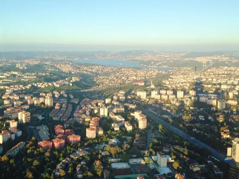 2010年に完成したばかりの「イスタンブール・サファイア」。約236メートルの展望台からは、黒海の方まで見渡すことができ、ボスポラス海峡に架かる橋や新市街の都会の街並みを一望することができます。