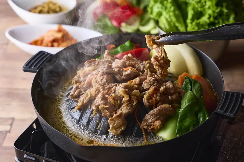 厚切りの豚バラ肉に、焼き野菜、もやしナムル、包み野菜までそろったボリュームたっぷりの「サムギョプサルセット」。追加メニューには、〆のうどんもあり、食べ応えも十分です。
