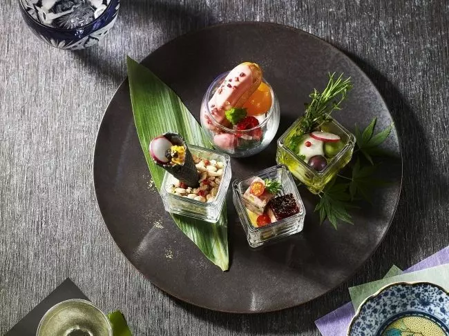 3種のオードブルキューブ/キャロットムース/まんまるオリーブ&モッツァレラ/抹茶といちごのプチドルチェ