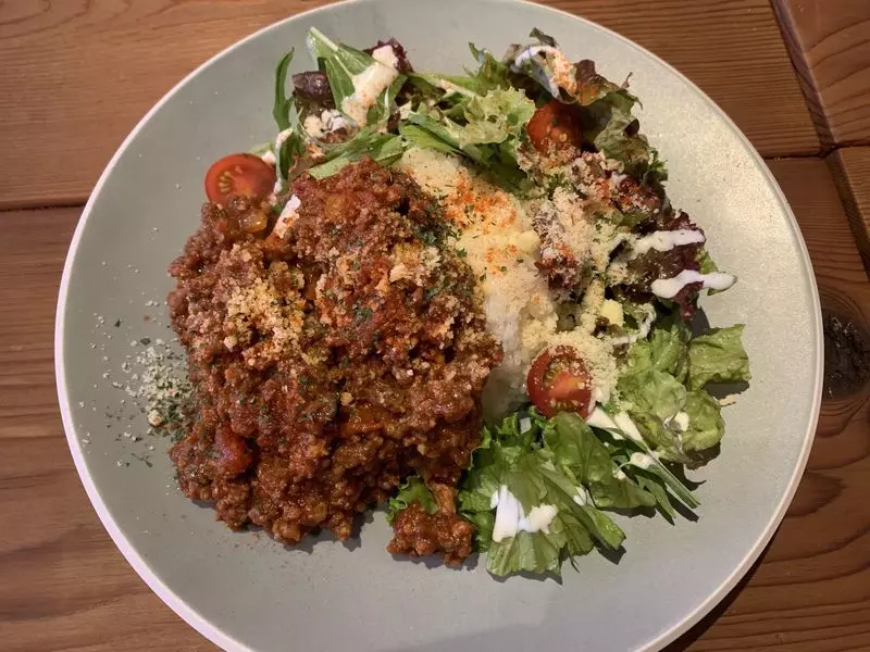 野菜と一緒に食べられるタコライスは辛味はなく、トマトとチーズが効いています。