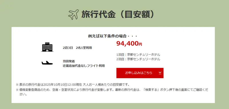 航空券付き3日間プランは、前後に宿泊日を設けてゆったりと京都を楽しみたい方におすすめ。羽田発着で94,400円(目安)と、特別な体験を考えればリーズナブルです。(※)