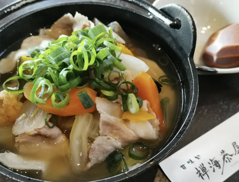 耶馬渓黒豚や山芋など、地元で採れる新鮮な食材を使用。中でも人気の「だんご汁」は、醤油ベースのやさしい味わいで、野菜と出汁の旨味が溶け合った心温まる一杯です。