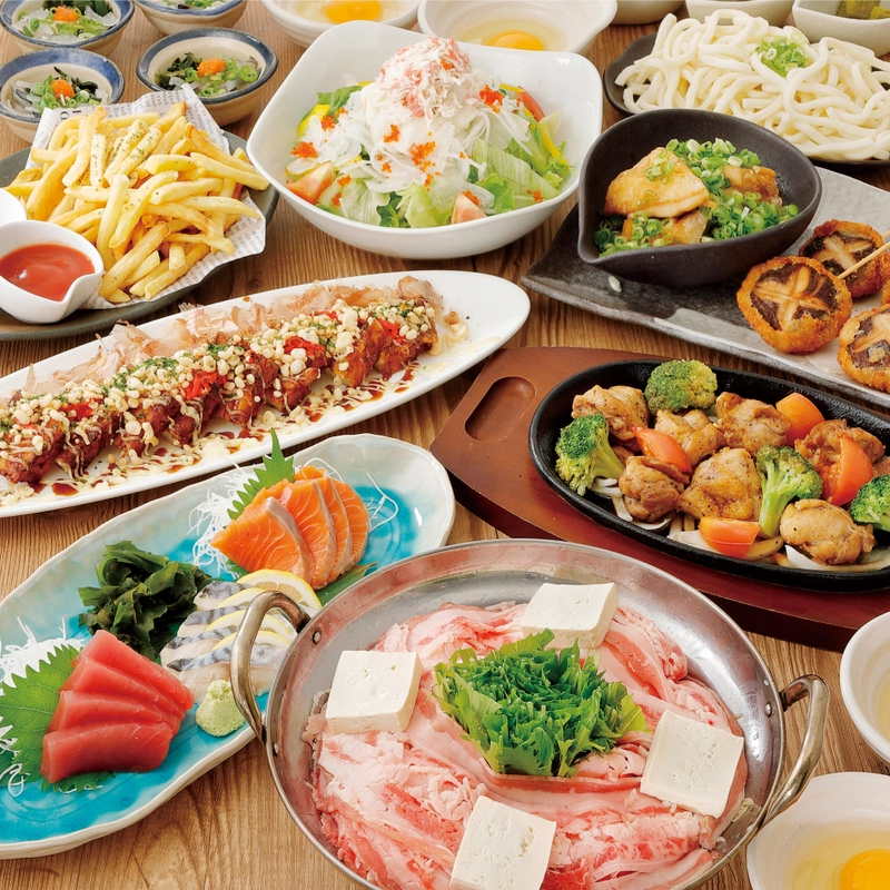 | 主な内容 | ・枝豆 ・温玉シーザーサラダ ・刺身2種盛り合わせ ・鶏の唐揚げ ・山盛りポテトフライ&チップス ・選べるメイン鍋 ・お好み焼き ・〆うどん ・シューアイス ◆選べるメイン鍋◆ A)国産牛もつ鍋 B)濃厚豚味噌鍋 ※予約時に選択がない場合は店舗のおすすめを提供させていただきます。 |