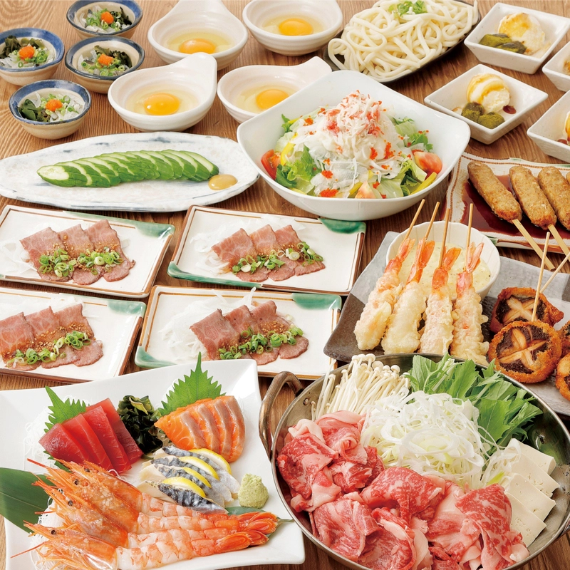 | 主な内容 | ・ふぐ皮ぽん酢 ・とちぎ霧降高原牛のローストビーフ ・いろはサラダ ・刺身4種盛り合わせ ・椎茸串&えび天串タルタル ・選べるメイン鍋 ・きゅうり浅漬け ・つくね串焼き ・〆うどん ・抹茶わらび餅アイス ◆選べるメイン鍋◆ A)北海道産さくらビーフすき焼き B)国産牛もつ鍋 ※予約時に選択がない場合は店舗のおすすめを提供させていただきます。 |