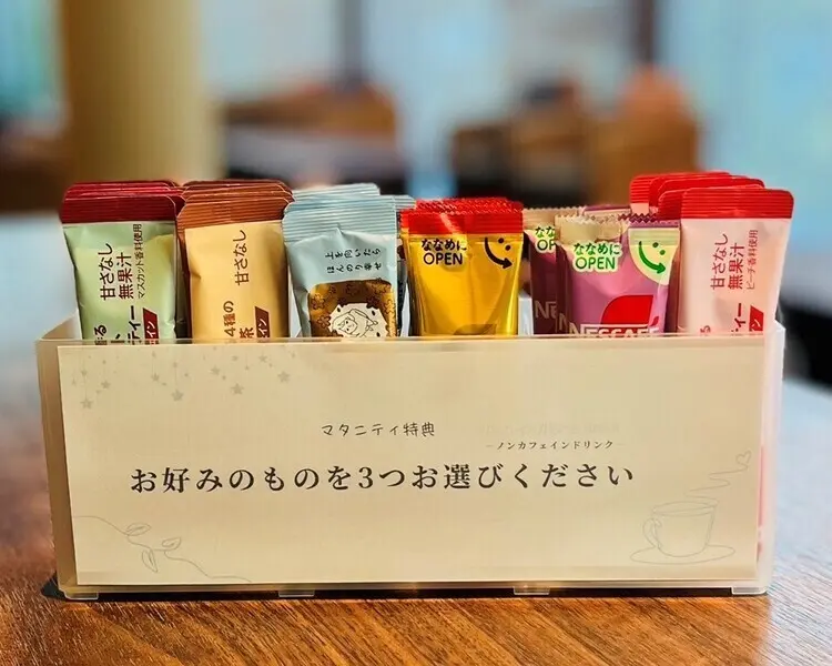 マタニティ特典の1つが、カフェインレスのインスタントドリンク3袋のプレゼント(※)。チェックイン時に、妊娠中でも飲みやすいドリンクを6種類の中から選べます(※)。