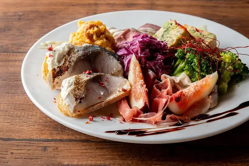 まずはじめに注文したいのが「前菜7種盛り合わせ(2名盛り)」1,650円(税込)(※)。紫キャベツのラペや生ハムと季節の果実、フリッタータなど、彩り豊かな前菜が並ぶひと皿。