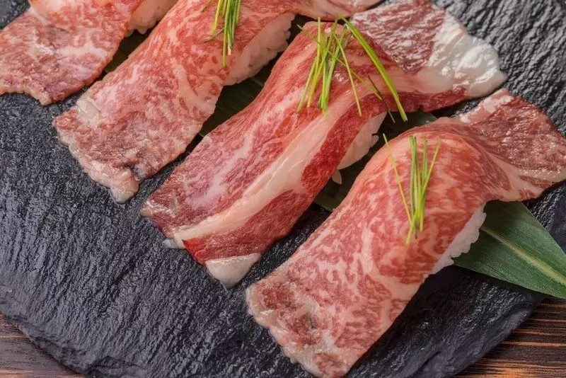 和牛のお肉をレアで焼き上げることで旨味が凝縮。トロっと口の中でとろけるお肉は自家製タレとの相性抜群!机の上に広がる長ーいお寿司は友達とシェアして食べてみてくださいね!