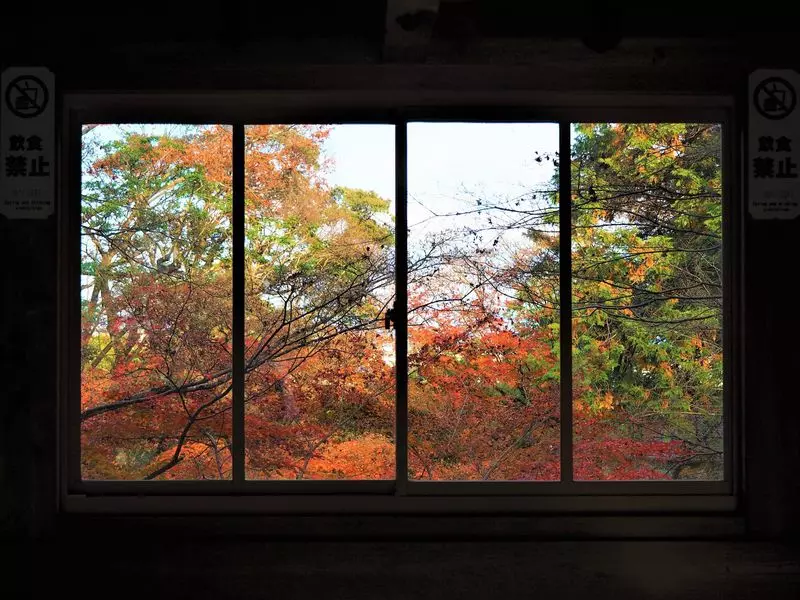 社殿の近くにある休憩所の窓からは、先ほどご紹介した紅葉庭園が見えるんです◎