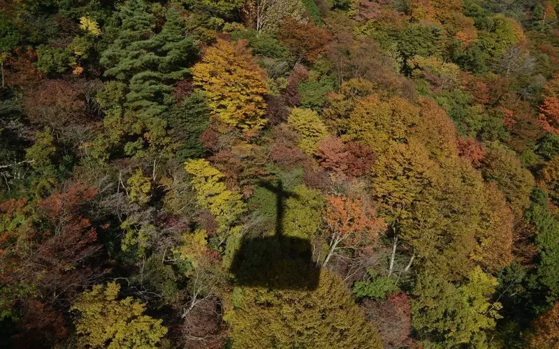 標高1,100mを登るためのロープウェイからは、打見山と蓬莱山、2つの山の紅葉風景が楽しめます。4月~11月の観光シーズンは、ロープウェイに乗りながら景色を楽しむことができるよう、低速運転(秒速7m)で運行されています。