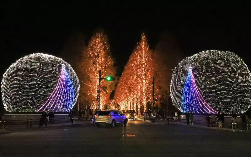 メタセコイアの20本の木に張りめぐらされた電球がキラキラ輝きまばゆいばかり。
