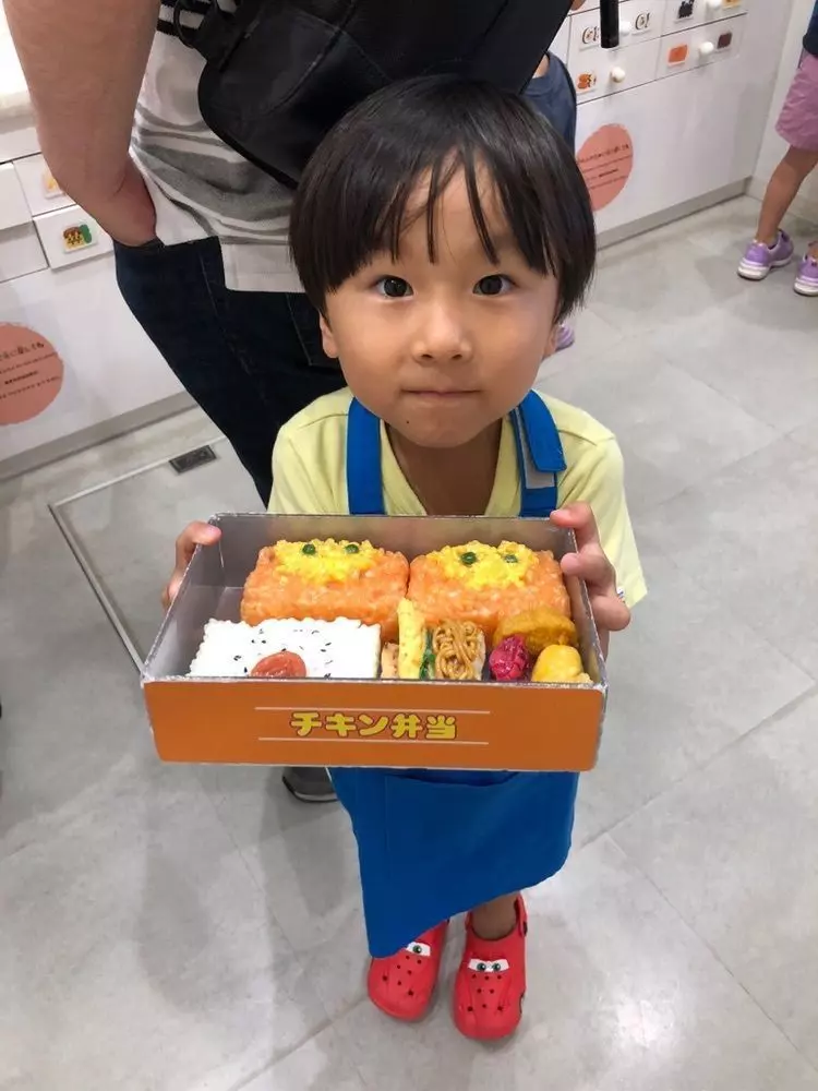 エプロンも用意されていて、ちっちゃな店員さんが、オリジナルのお弁当を作ってくれて提供してくれます😊本物みたいで美味しそう!!
