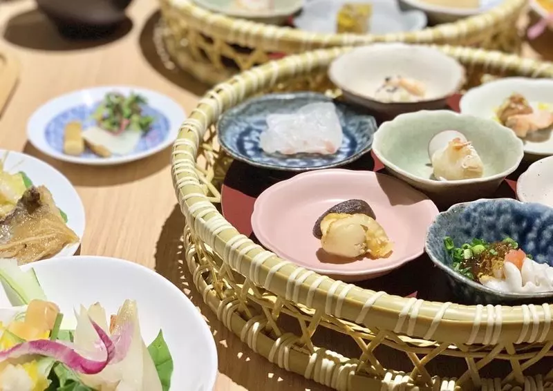 テーブルに置いてある空のカゴを持って…、好みの和食小鉢を選んで自分で八寸を作ります!