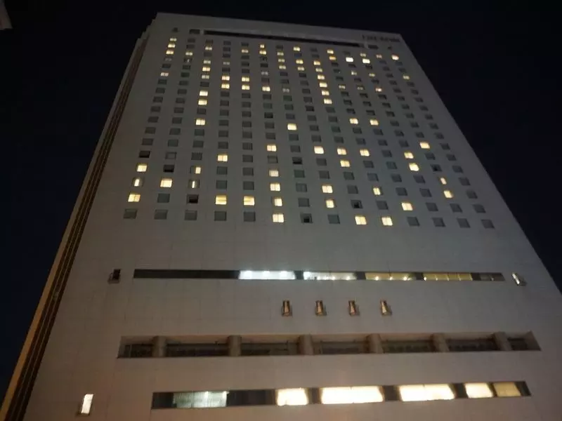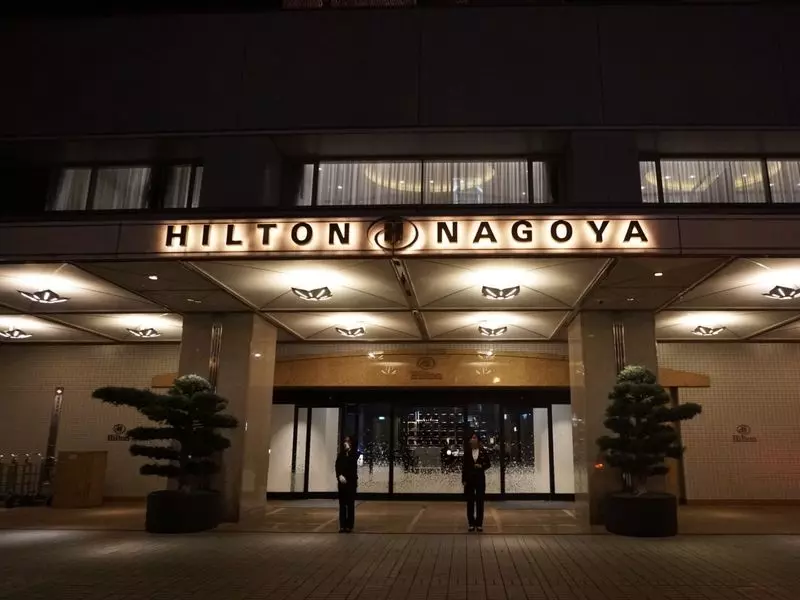 ヒルトン名古屋に到着です。歩いて向かうと、途中からそびえ立つように立つヒルトンが見えてくるはず。この辺はホテルが多いですが、その中でも圧倒的な存在感です。エントランスには常時スタッフがいてくれるので、夜に到着でも安心です。