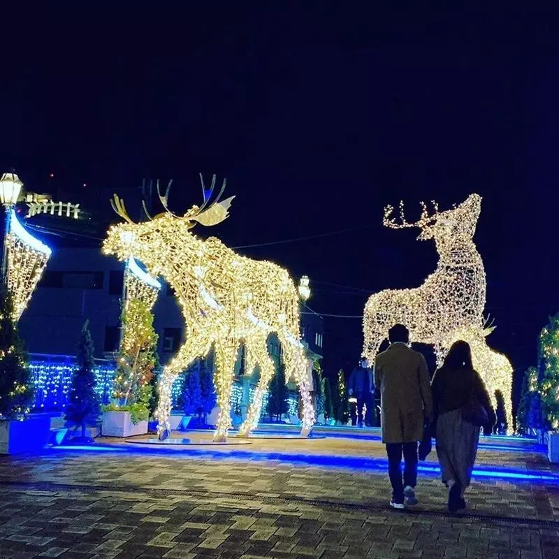 真っ直ぐ進むと橋があり、その上にはライトアップされたトナカイのモニュメントがあります。