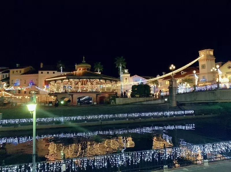出口のすぐ左側にあります。ヨーロッパ風の街並みとイルミネーションがとてもお洒落。このエリアには写真を撮るカップルが集まってました。