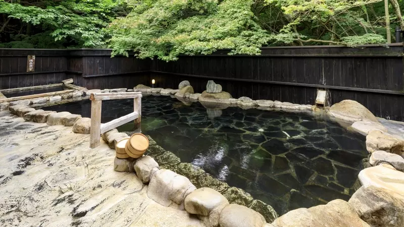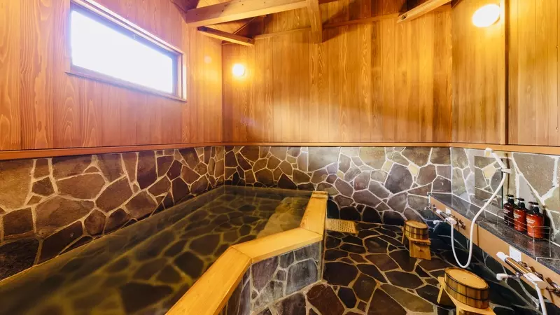 宿の温泉は、檜と岩を組み合わせたデザインが特徴です。温泉らしい空間となっており、心地よく湯船に浸かれます。