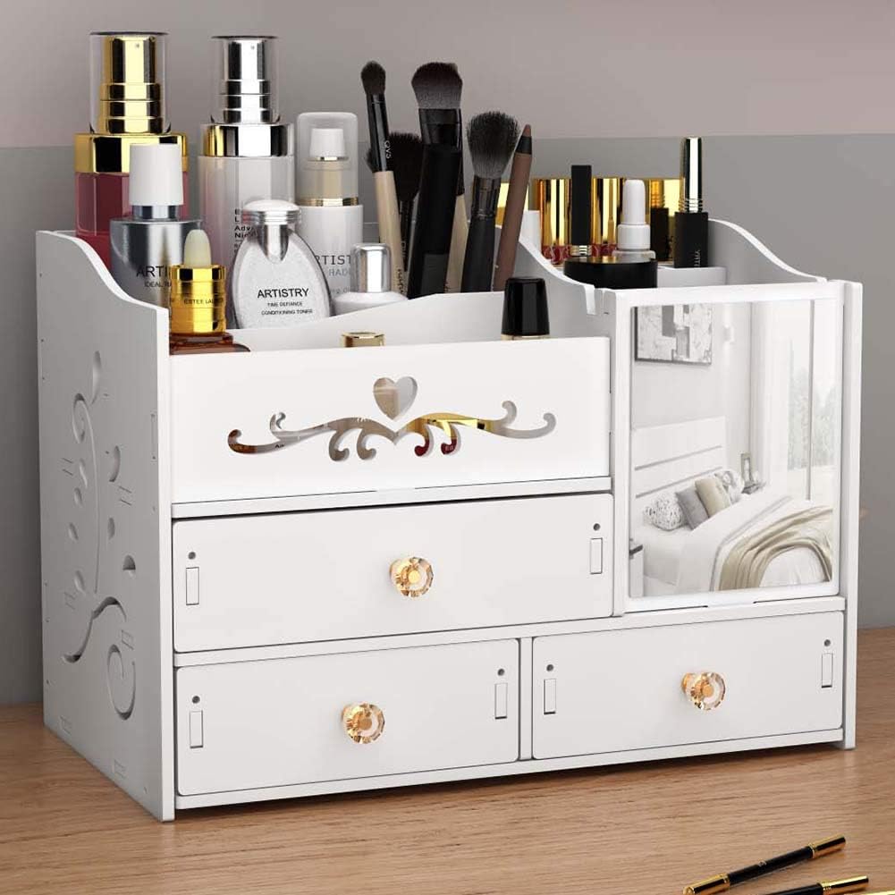 取り外しのできる小物トレー・口紅やアイライナーなどを収納できる細長い小物立て・大容量の化粧品スペース・小物収納に適したワイドな引き出しなど、整理整頓に嬉しい機能がたくさん備わっています。