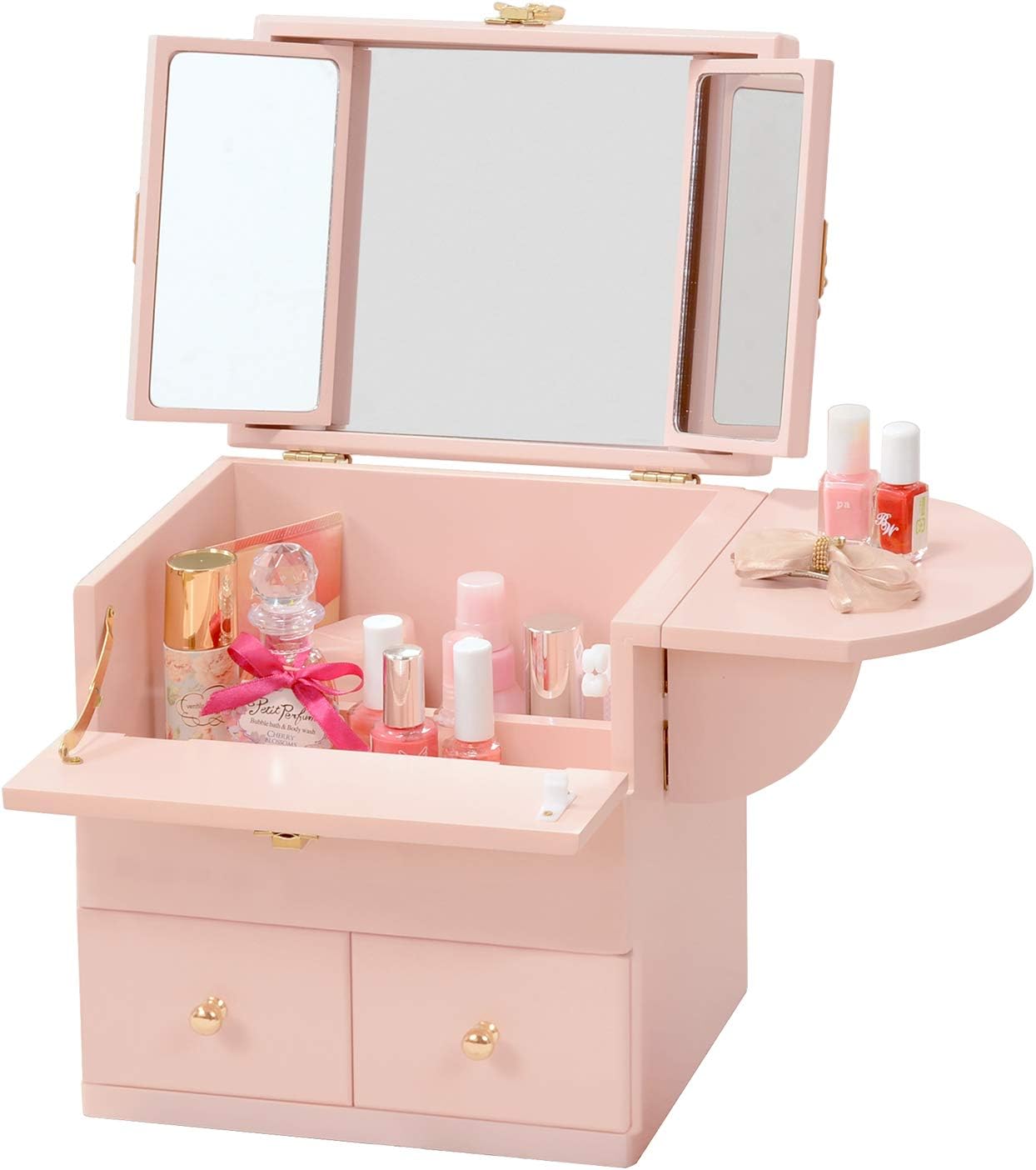 そして、鏡が三面鏡なので顔のサイド部分までしっかりメイクが完成します。また、再度には折り畳み式のサイドテーブルが付いており、コスメを置きながらゆったりとメイクできます。