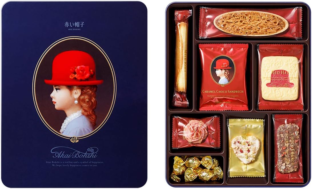 レトロな趣きを感じる缶やパッケージが魅力の「赤い帽子」は、幅広い世代の女性に人気を誇っています。見た目もかわいく、食べる前も食べた後も幸せになれるギフトセットです。