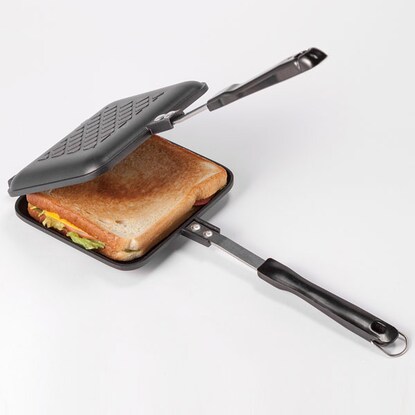 素材はアルミニウムで軽くコンパクトな作りのため、王道のハムチーズやアボカドなどを挟んで薄くカリカリに焼き上げるのがポイント。直火・ガス火専用で、IH調理器には非対応なので注意してください。