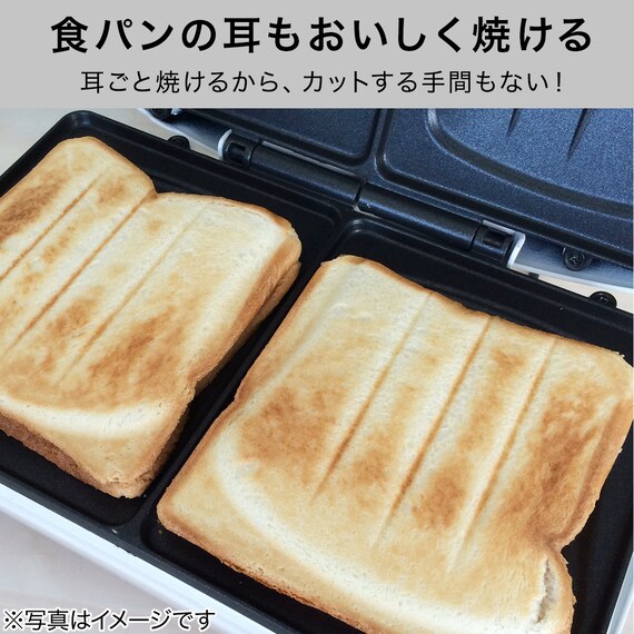 続いてご紹介するおすすめホットサンドメーカーは、アイリスオーヤマの「マルチサンドメーカーダブルサイズセット」です。ワッフルプレートとホットサンドプレートが付属していて、料理の幅が広がります。ホットサンドプレートを使用するときは、耳をカットせずに一度に2枚焼けるのがポイントです。