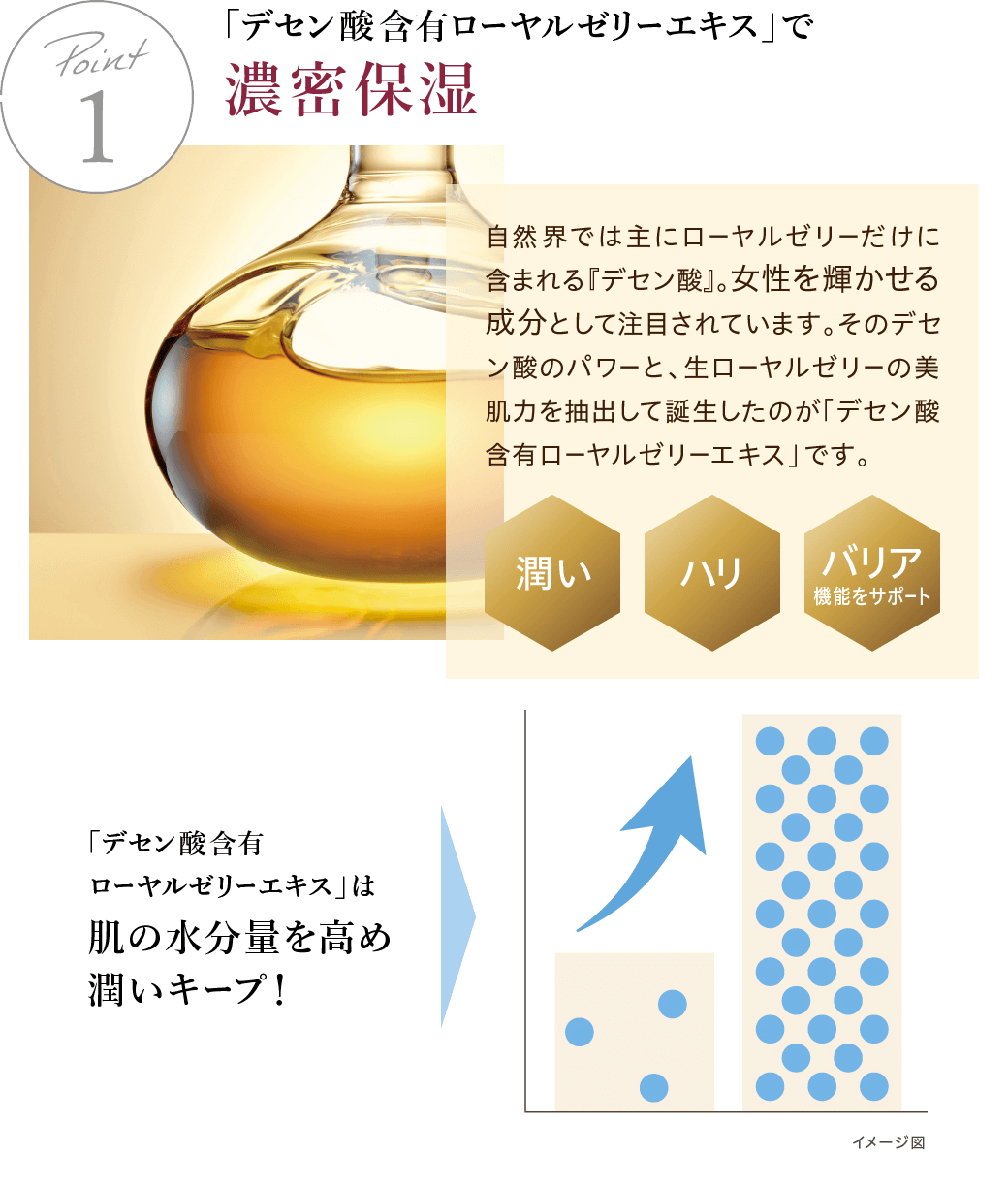 朝のスキンケアに使用すれば日中は皮膚の乾燥を防ぎ、夜のスキンケアでは皮膚にうるおいを与え、毎日フレッシュでなめらかな肌へ導きます。