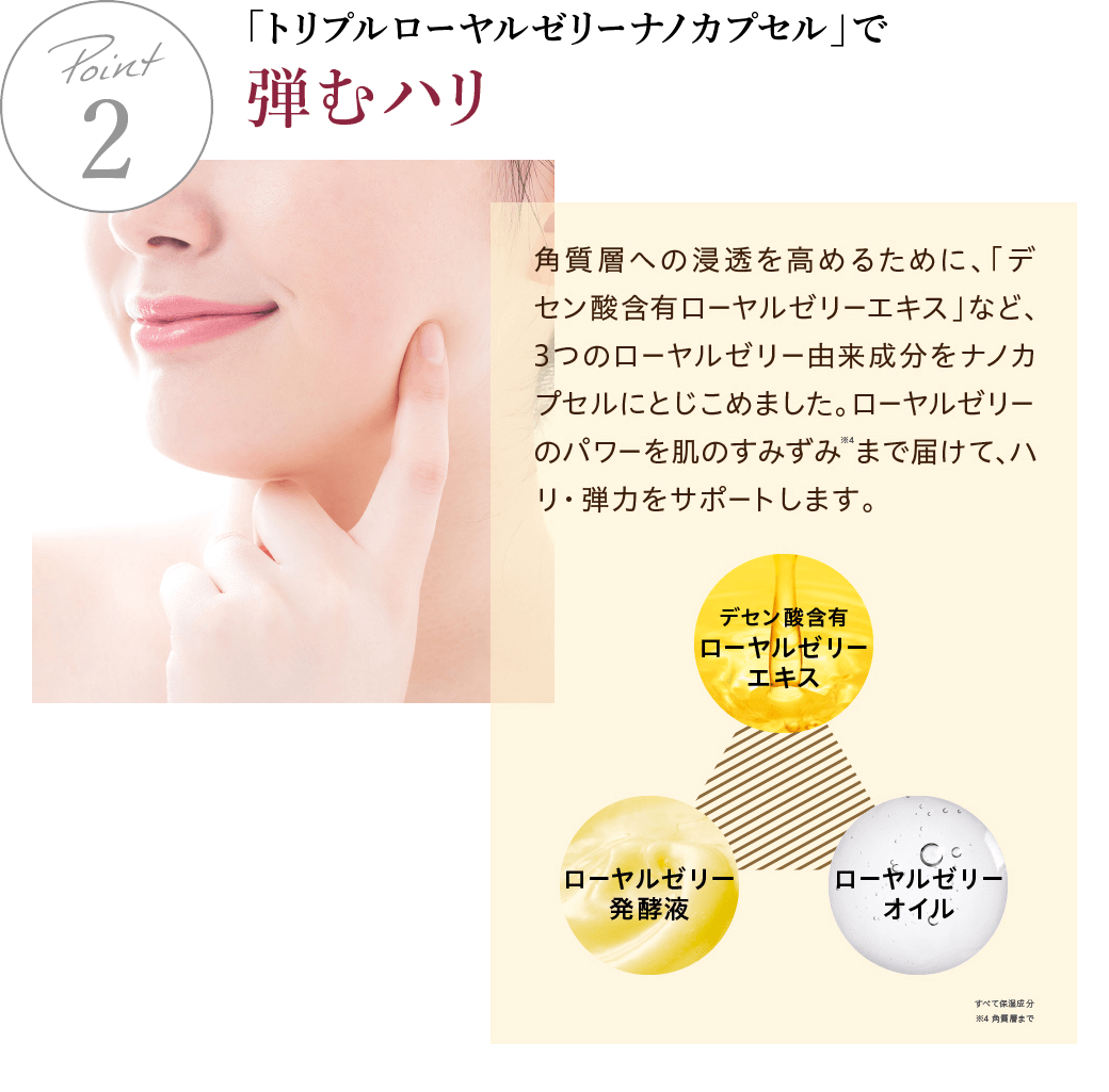 気になる毛穴や、古い角質層によるくすみ、乾燥による小ジワなど、年齢とともに気になるお肌の悩みに多角的にアプローチします。