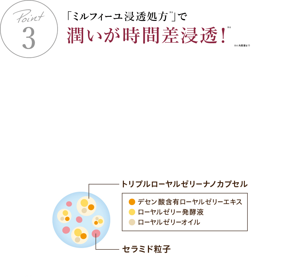 ミルキージェルのテクスチャーが肌の角質層まで入り込み、気になるベタつきを残さない使用感。使い心地の良さも嬉しいポイントです。