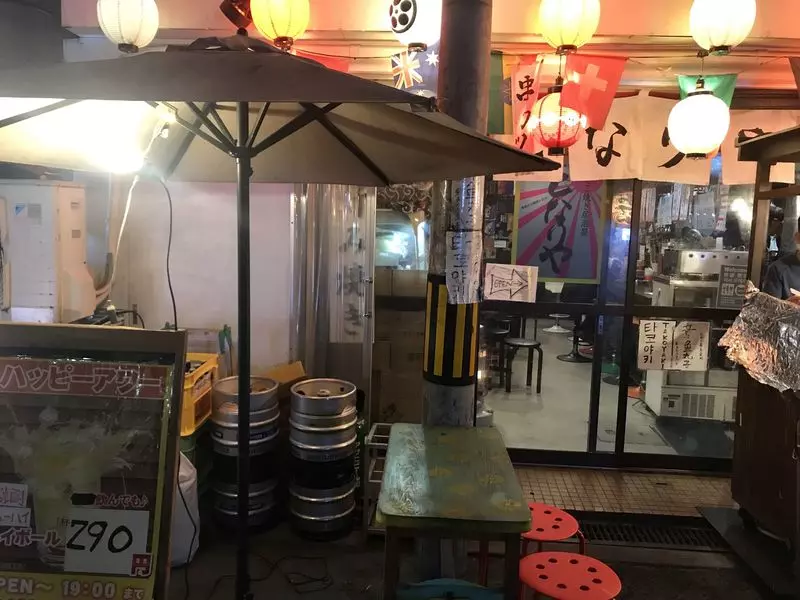 ホテルを出て1分もかからず着くのが「たこ焼き居酒屋 となりや」。カウンター席とテーブル席があるので、おひとり様・グループ共に利用可能です。