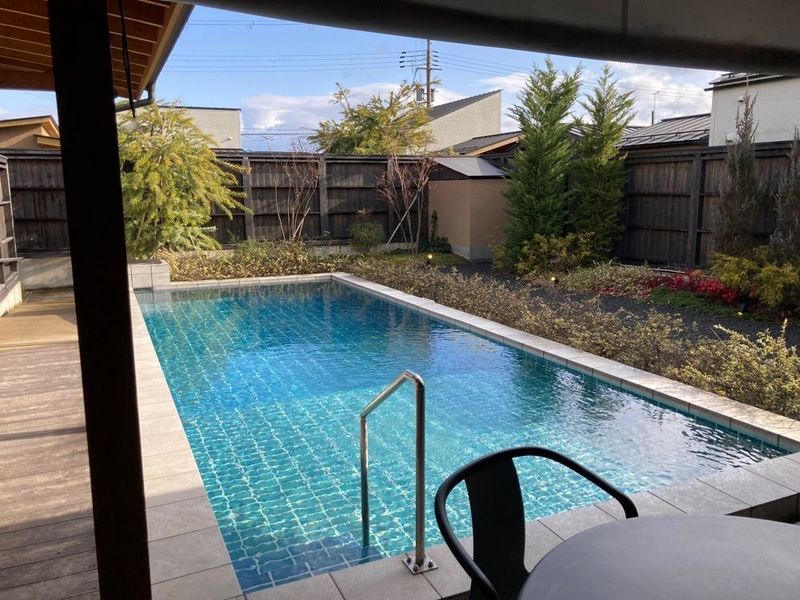 珍しい赤湯の露天風呂と中庭プールが、全棟に完備されています。(露天風呂写真撮るの忘れてた💦)
