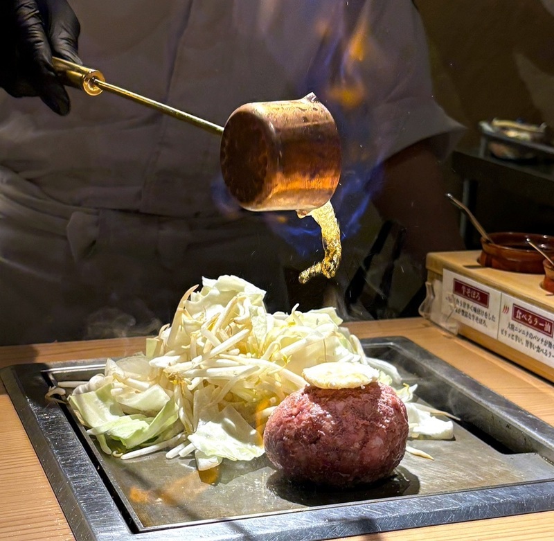 ハンバーグは、目の前にある自分専用の鉄板で一口ずつ焼く、焼肉スタイルの新感覚ハンバーグ。