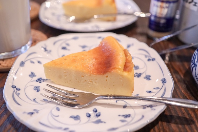 酒粕を使った面白いメニューを発見しちゃいました。気になった酒粕ラテとチーズケーキを注文しましたよ。チーズケーキはしっとりとして柔らかい食感ですね。お店で作っている自家製のケーキとのことでした。