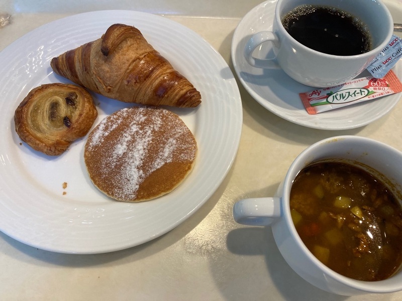 宿泊者割引🈹もあり、新鮮なサラダ、フルーツ、稲庭うどん、クロワッサン、カレースープ等々あり楽しめました‼️