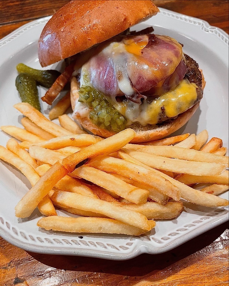 具材はパティの他にベーコン、オニオン、チーズ、刻まれたピクルスなどです。
