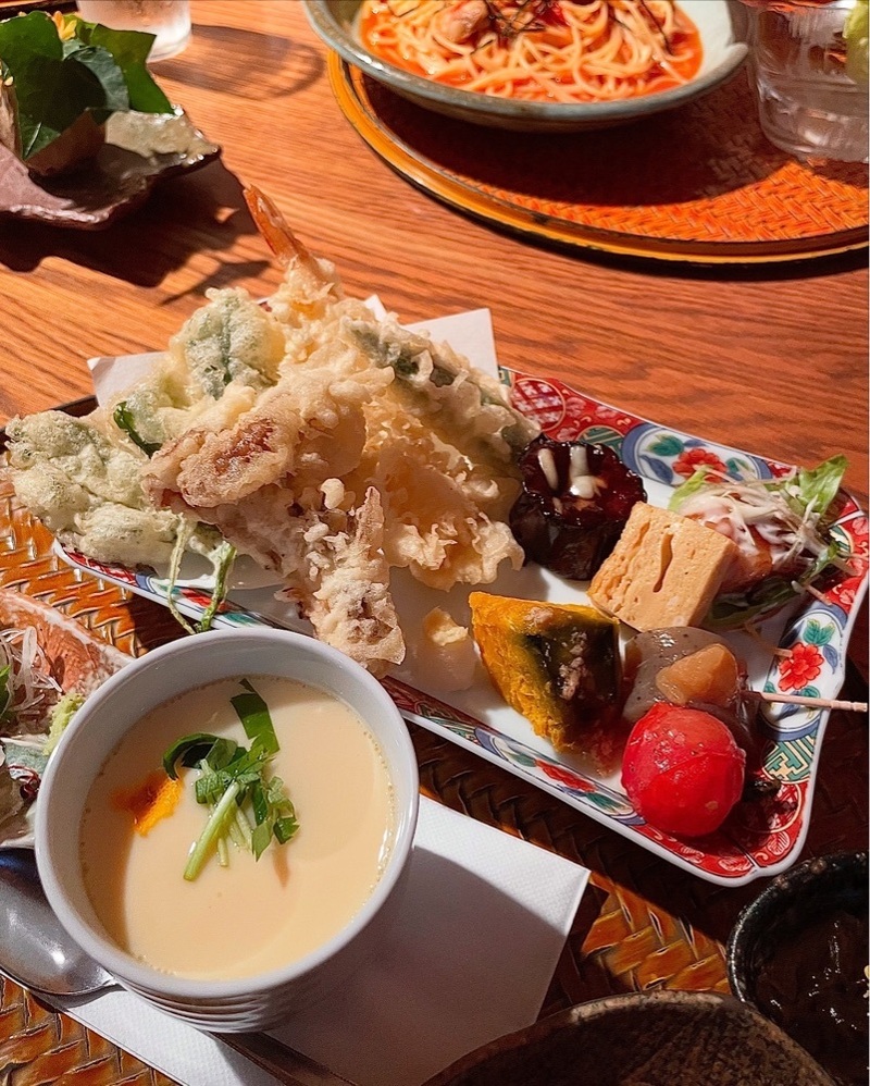 どんぐり定食は、天ぷら、旬の食材を使った一口おかず、お刺身、もずく酢、茶碗蒸しなどにご飯、味噌汁、香の物が付きます。