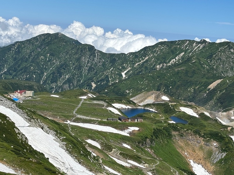 一の越山荘までは石畳、雪渓を5.6ヶ所越えながら、富山市の小学6年生らと、目指すは雄山!と。彼らは途中三の越で休憩,私は一気に雄山へ!がれ場がずっと続きます、グローブをはめて、両手を岩場に置きながら体を上に!