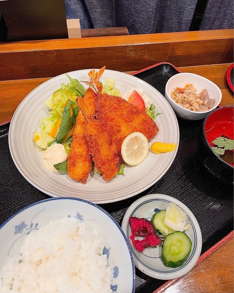 海老フライ、鯵フライ、ヒレ串カツ、サラダ、ご飯、お吸い物、小鉢、香の物のセットです。