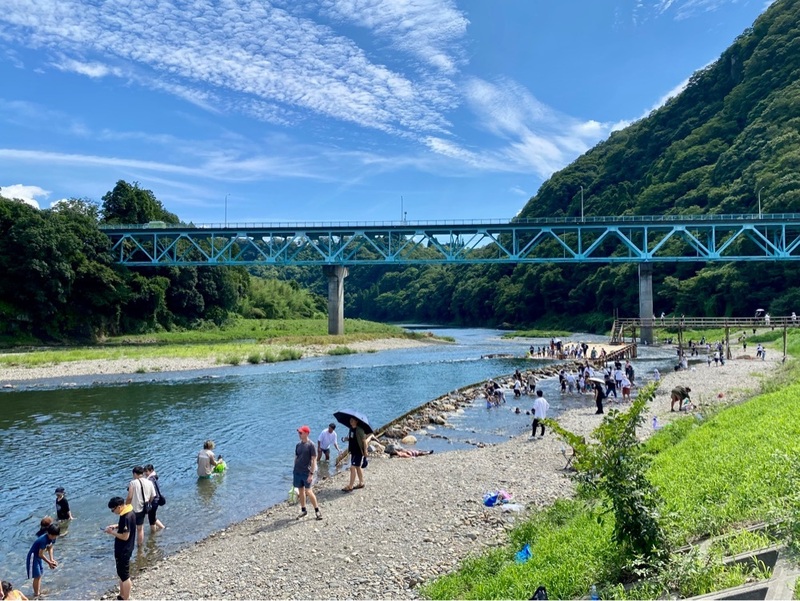 川で遊ぶ人、鮎を食べる人は長い列に並んでいました。「やな」のところに行ってみると川の流れがとても強かったです。大きなナマズが上がってきた時はびっくりしました。